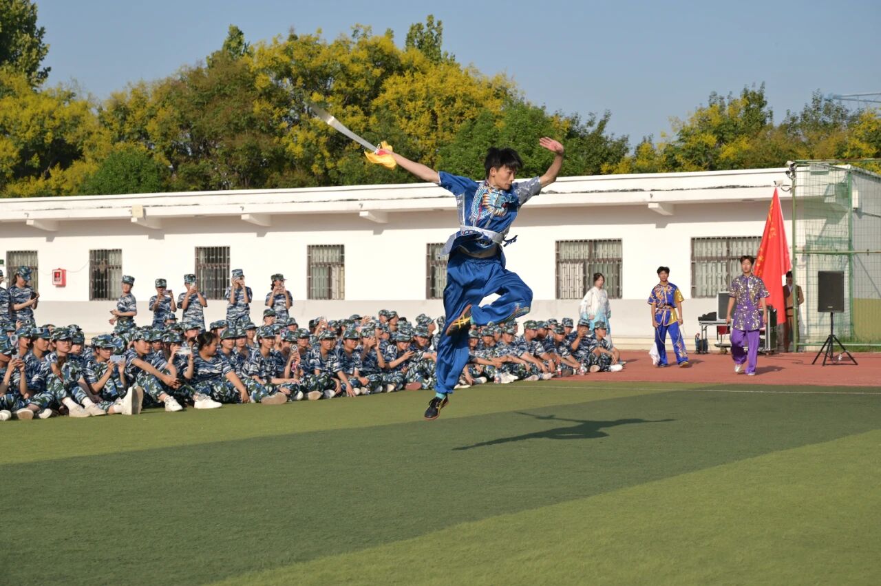现场互动频繁,氛围热烈。当熟悉的旋律响起,不少新生情不自禁跟唱;舞蹈节目节奏明快,台下掌声与节拍同频共振;武术表演引发阵阵喝彩。在节目尾声,师生齐声合唱《我和我的祖国》,场面壮观而感人。很多新生表示,这样的文艺演出不仅缓解了训练的疲惫,也让他们在歌声和掌声中感受到学校的温暖和集体的力量。2025级体育教育专业新生余翰林说:“这是我第一次在军训场上看演出,也是第一次这么近距离感受到艺体学部的魅力,太震撼了!”