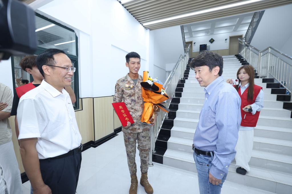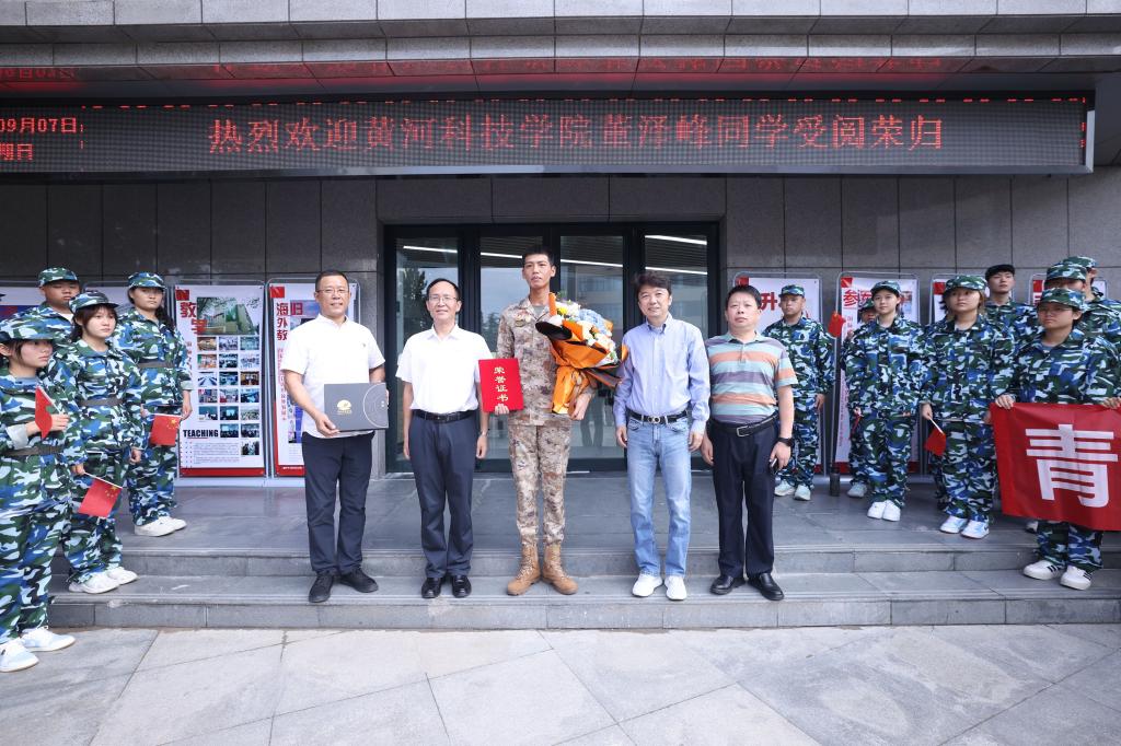 杨保成询问其身体和生活情况,对董泽峰不畏艰苦、顽强拼搏的精神表示高度赞许。杨保成说,作为一名亲身参与国家盛事的青年学子,董泽峰在阅兵式上的铿锵步伐,不仅体现对历史的深深敬意,更是当代年轻人肩负时代责任的真实展现,生动诠释了黄科大学子的昂扬风采。“希望你能把从训练中获得的顽强意志、从阅兵中体悟到的家国担当,传递给更多同学,让训练场和阅兵场上的宝贵经历与深刻感悟,变成校园中真切可触、可学可做的成长动力,带动广大同学共同践行‘请党放心,强国有我’的青春誓言。”杨保成校长亲切地叮嘱道。