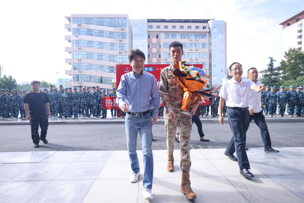 董泽峰又前往国际学院军训场地,为正在训练的同学们带来了一场精彩的分列式动作演示。他眼神坚毅,动作干净利落、整齐划一,每一个细节都展现出阅兵训练的严格标准与军人风范。同学们目不转睛地观看,不时发出阵阵赞叹与掌声。