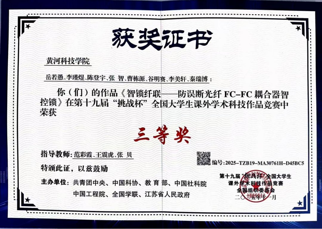 近期从大赛组委会传来好消息,在2025年第十九届“挑战杯”全国大学生课外学术科技作品竞赛中,我校参赛作品《智锁纤联——防误断光纤FC-FC耦合器智控锁》荣获全国三等奖。